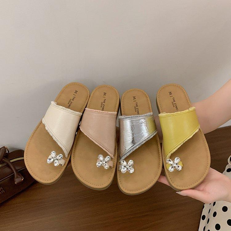 Weichsohlige Hausschuhe Damen Sommerbekleidung 2025 neu Französische Internet-Berühmtheit Strass Zehenbedeckt Flachboden Strand Cool Hausschuhe