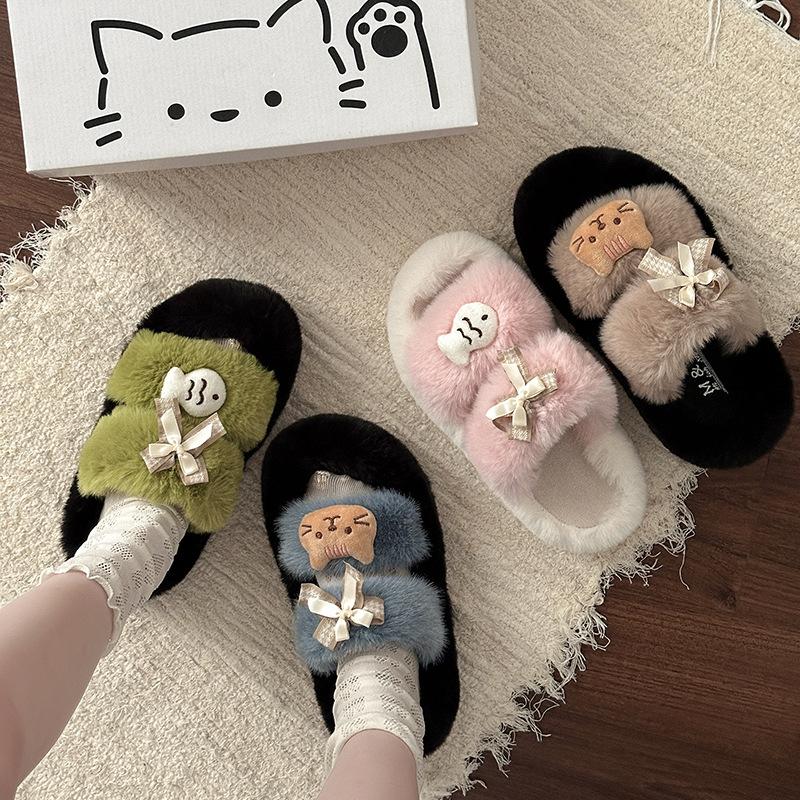 Vielseitige lässige flauschige Hausschuhe für Damen Herbst und Winter 2025 Cartoon niedliche Katze und Fisch warme dicksohlige Baumwollhausschuhe