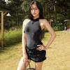 French Pure Desire Sexy Wooden Ear Patchwork Halterneck Dress Female Autumn Brown Sexy Open Back Slim-Fit Hip-Wrapped Short Dress