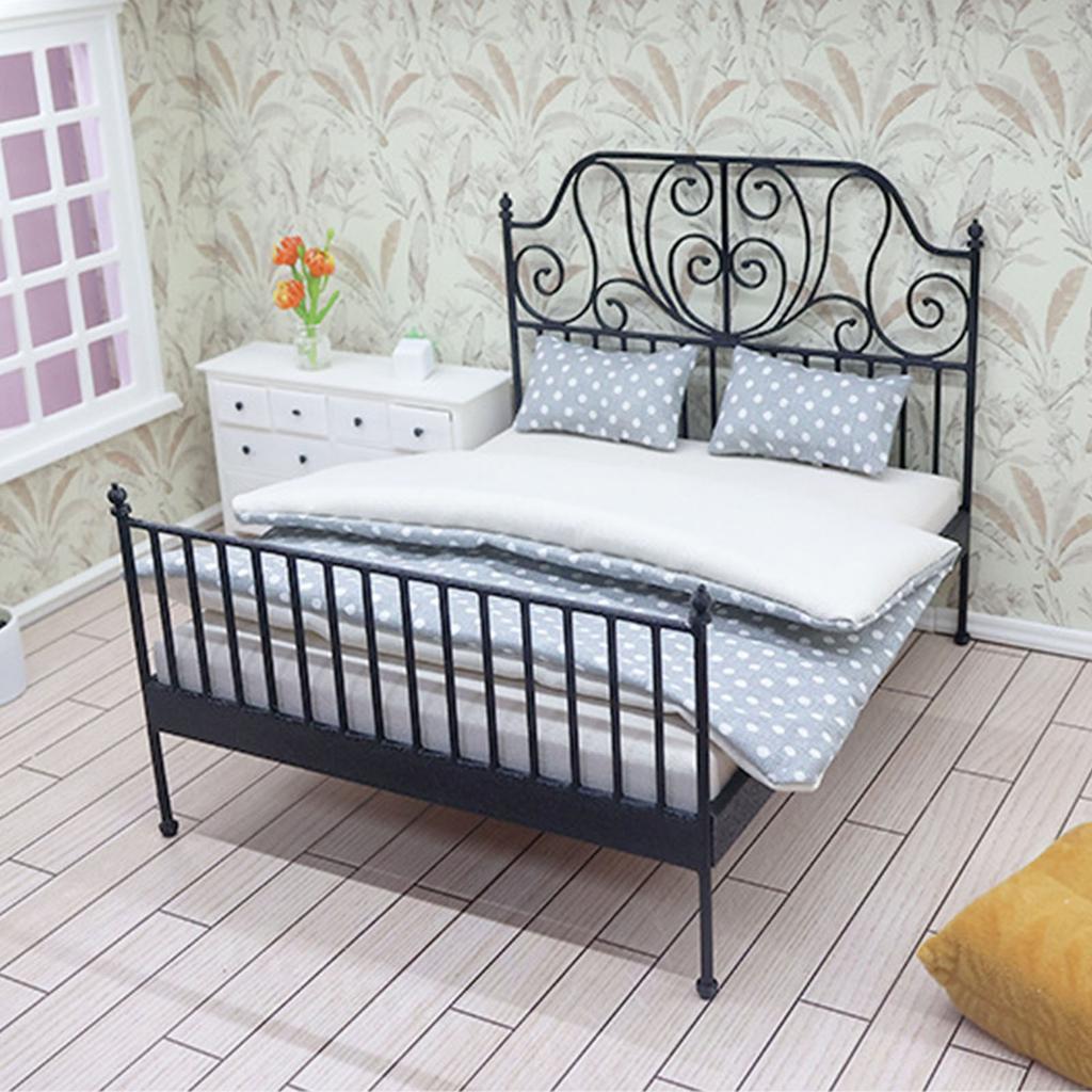 Maßstab 1/12 Miniatur Doppelbett Eisenbett mit abnehmbarer Bettwäsche Puppenhaus Modell Szenenrequisiten Bastelprojekt Dekoration