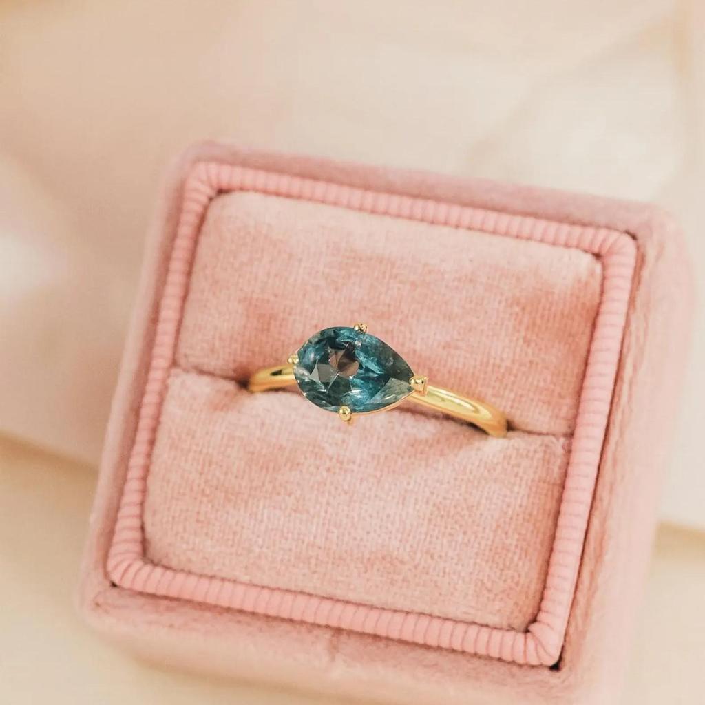1.5ct East West Pear Teal Sapphire Engagement Ring: Dainty Yellow Gold Plated Solitaire Wedding Ring: Art Deco Bridal Jewelry Gift