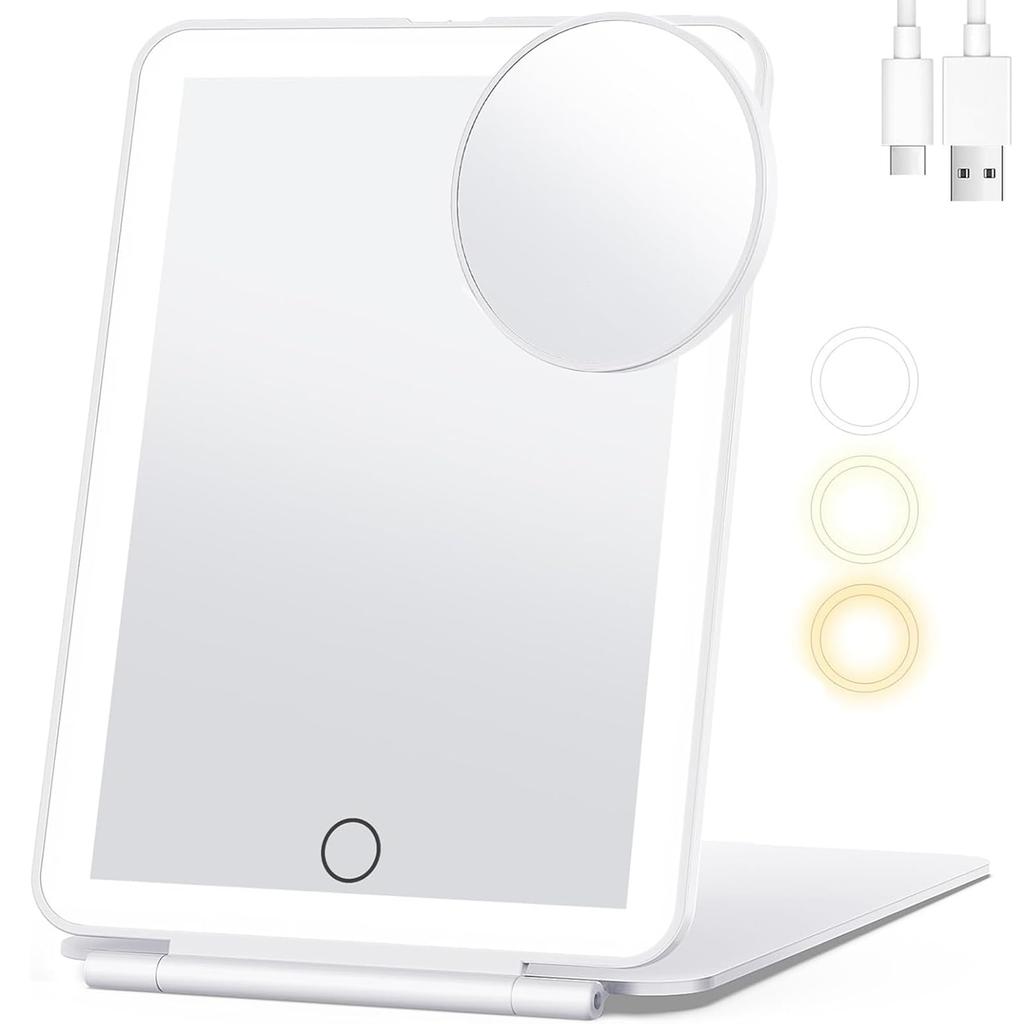 Desktop makeup mirror with 3 color LED light stepless brightness magnifying angle compact storage and easy settings, foldable, touchscreen,