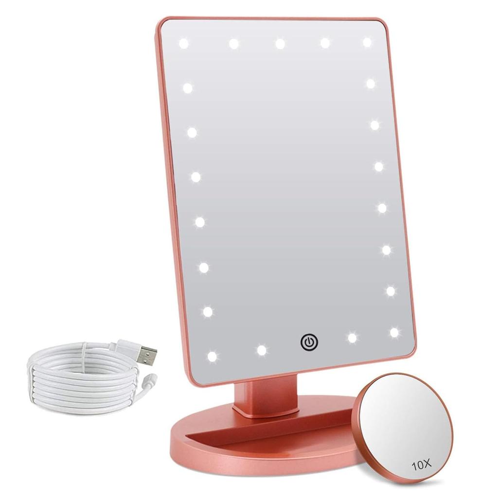 FASCINATE Mirror with Tabletop Stand Stepless 10x Adjustable Popular Pink 21-LED Light, Mirror, Dimming, USB/Battery Powered, Magnification, Bright,