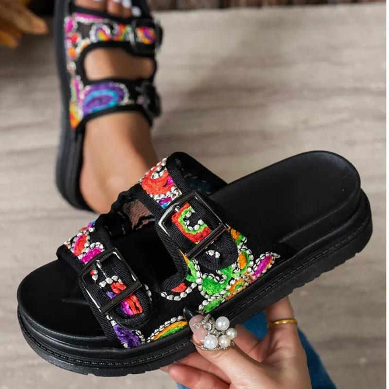 Mode Bunte Dicke Sohle Sandalen Sommer Damenmode Doppelschnalle Outdoor Große Größe Zapatos Blumenmuster Frau Slipper zum Hineinschlüpfen