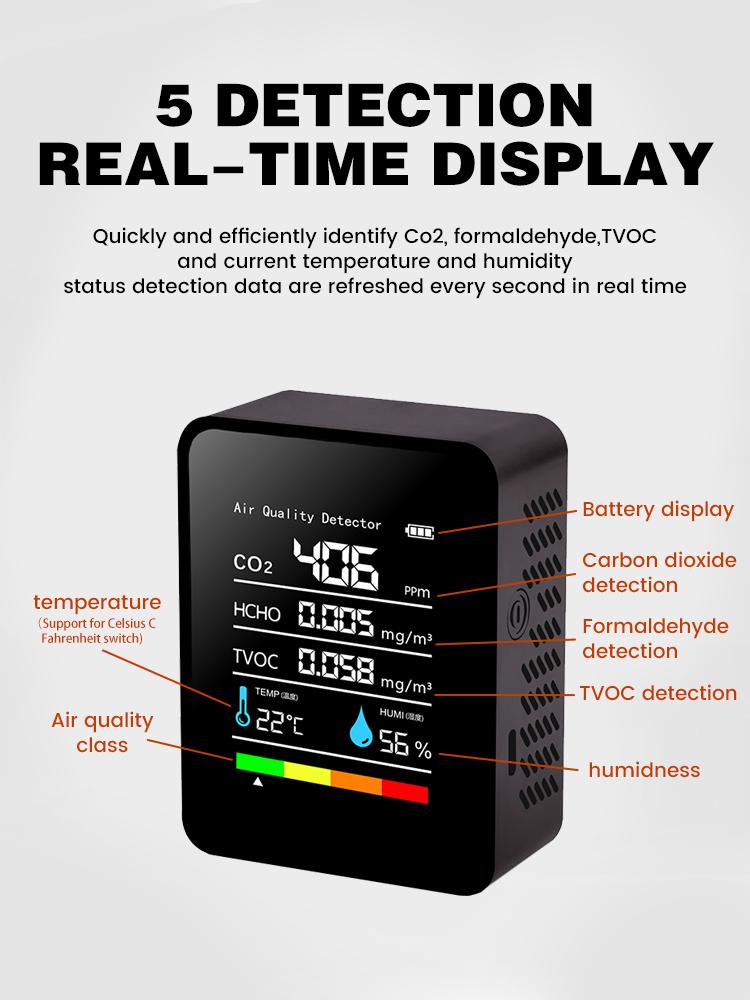 5-in-1 Air Quality Monitor Air Quality Detector CO2 Detector Formaldehyde HCHO TVOC Tester LCD Temperature Humidity Tester Alarm