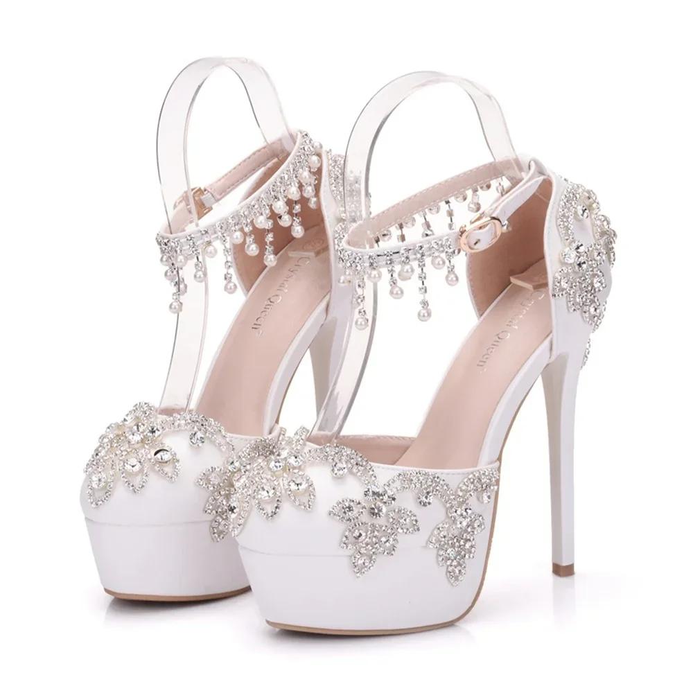 Mode 2025 Damen Sommer Sandalen Weiß Runde Zehenpartie Braut Hochzeit Damen High Heels Kleiderschuhe Strass Knöchelriemen
