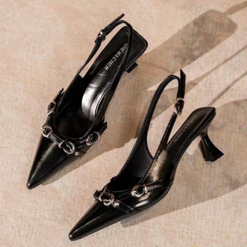 Mode Modische Baotou Sandalen Damen Neu Spitz Zehenbereich Flacher Ausschnitt Metall Schnalle Set Fuß Rutschfest Abriebfest Absatz Schuhe