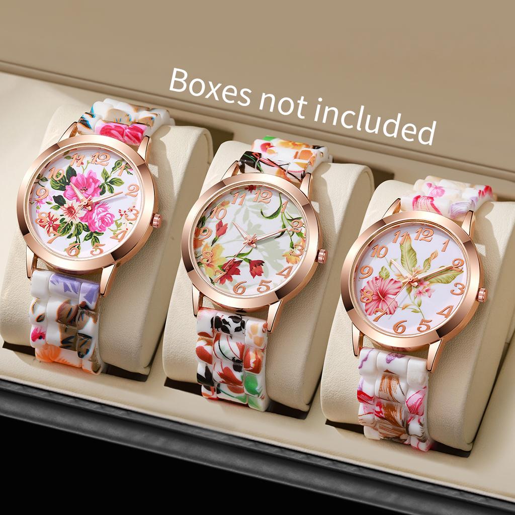 3 Stück/Set Damen Silikon Bedruckte Uhr Mode Lässig Personalisiert mit Floralem Zifferblatt Klassisch Trendige Quarz Uhr Kombinationsset