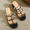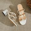 Mode Neue Dame Britischer Stil Weiß Nieten High Heel Pantoletten Offene Zehenschuhe mit Nähten Weite Passform Mikrofaserleder Zapatos Mujer
