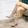 Mode Damen Winter Spitzschuh Stilettoabsatz Schlankmachende Stiefel Blockabsatz Stiefel Schnallendesign Falten Langstiefel Vulkanisierte Schuhe