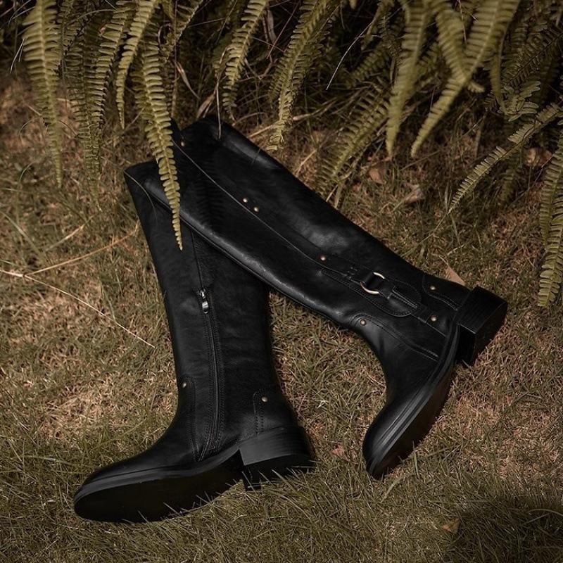 Rindslederbrett~ Hohe Ritterstiefel Metallschnalle Schwarz Aber Kniestiefel Skinny Retro Dicker Absatz Western Cowboy Stiefel