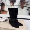 Rindslederversion weißes Reh dicker Absatz mittelhohe Stiefel Retro Gürtelschnalle spitz zulaufende Western-Cowboystiefel echtes Leder Ritterstiefel