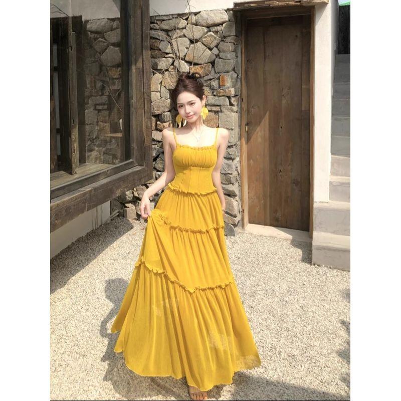 Kumikumi Design Sense Mesh Patchwork Sling Dress Women Summer Seaside Holiday Style High Waist Slimming Long dress