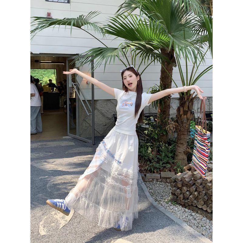 Kumikumi Sweet Style Set Waist Hugging Slimming Short sleeve T-shirt Women Summer High Waist All-Match Skirt Two-piece Set