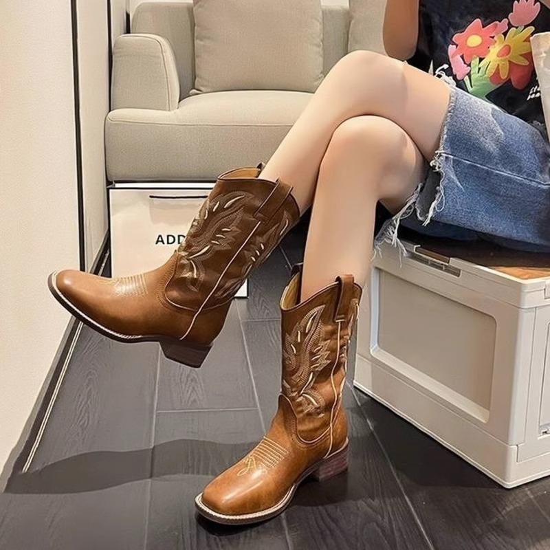 Cowhide version genuine leather western cowboy boots women's new embroidered long knight boots square heel boots summer