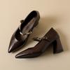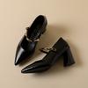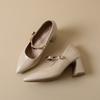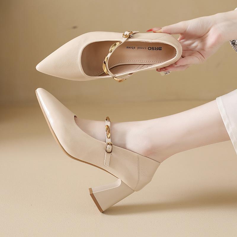 Französische spitze Zehen flacher Mund einzelne Schuhe Damen 2025 neu Frühling und Herbst Metall Ein-Wort-Riemen kleine Lederschuhe dicker Absatz Pendler hig
