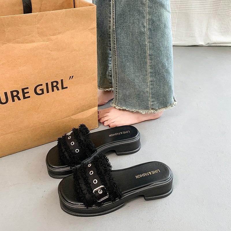 Coole Hausschuhe Damen Sommerbekleidung neue Gürtelschnalle Ein-Wort flacher Boden rutschfest Strandschuhe
