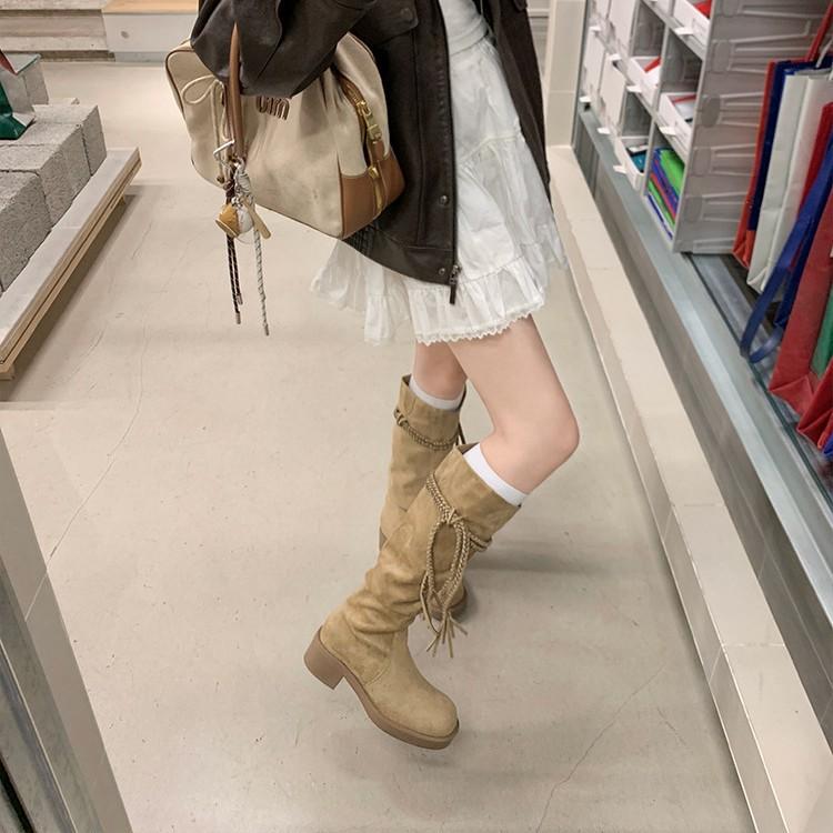 Su Yinyin gleiche ägyptische Stiefel~ runde Spitze mit Fransen dicker Absatz mittelhohe Stiefel Western-Cowboystiefel dicksohlige Stacking-Stiefel