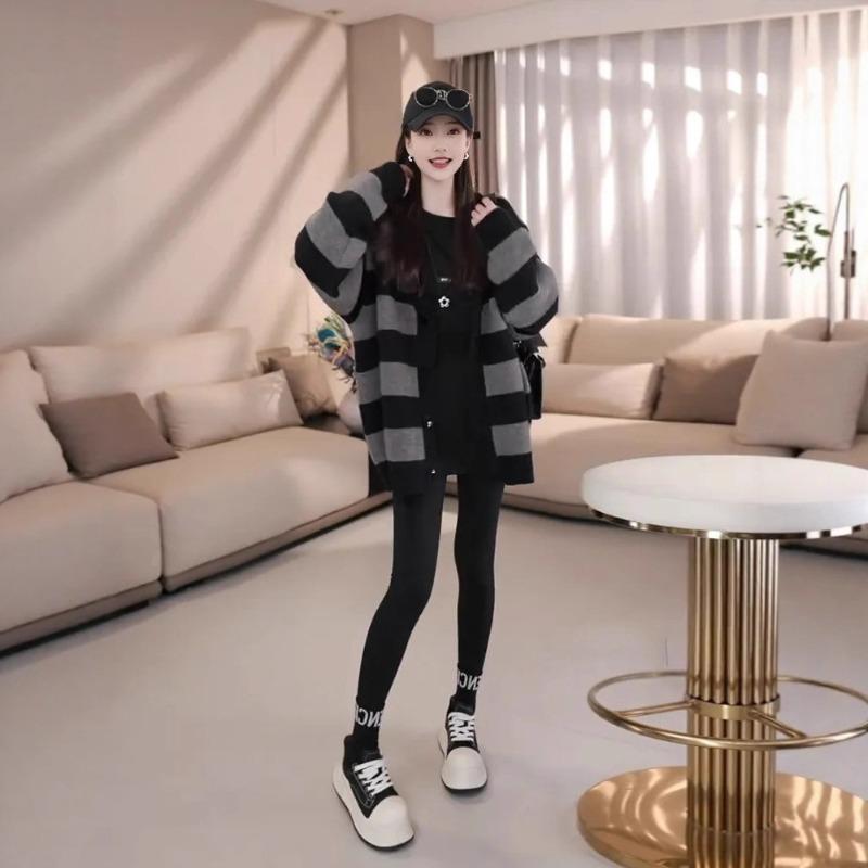 Large size autumn and winter new loose retro lazy style color matching striped sweater knitted cardigan jacket female trend