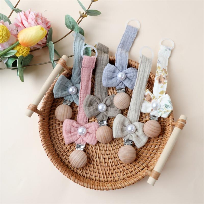 1 Stück Niedlicher Neugeborener Mädchen Schnuller Clip Kette Süße Prinzessin Schleife Schnullerclip Kette Stoff Holz Anti-Verloren Spielzeug Schnullerkette