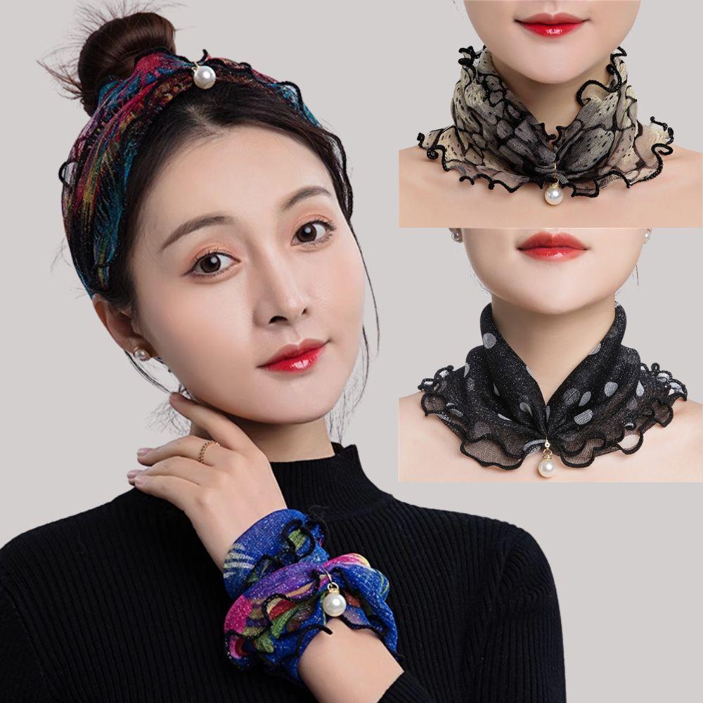 Summer Organza Neck Collar Pearl Pendant Ruffle Lace Scarf Women Elastic Loop Scarf Multi-functional Neck Wrap Bandana Headband