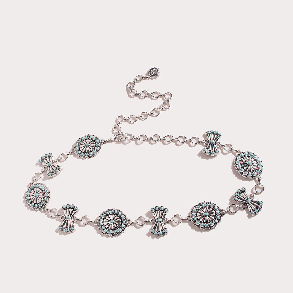 New Retro Geometric Carved Turquoise Heavy Industry Women's Metal Waist Chain Elegant Palace Style Quality