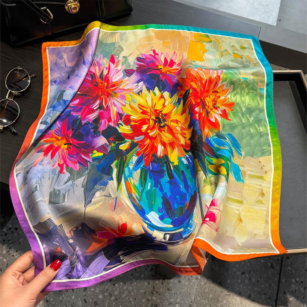 Luxury 100% Mulberry Silk Scarf Women Oil Floral Print Bandana Shawl Lady Neckerchief Handkerchief Female Decorative Wrap 53cm