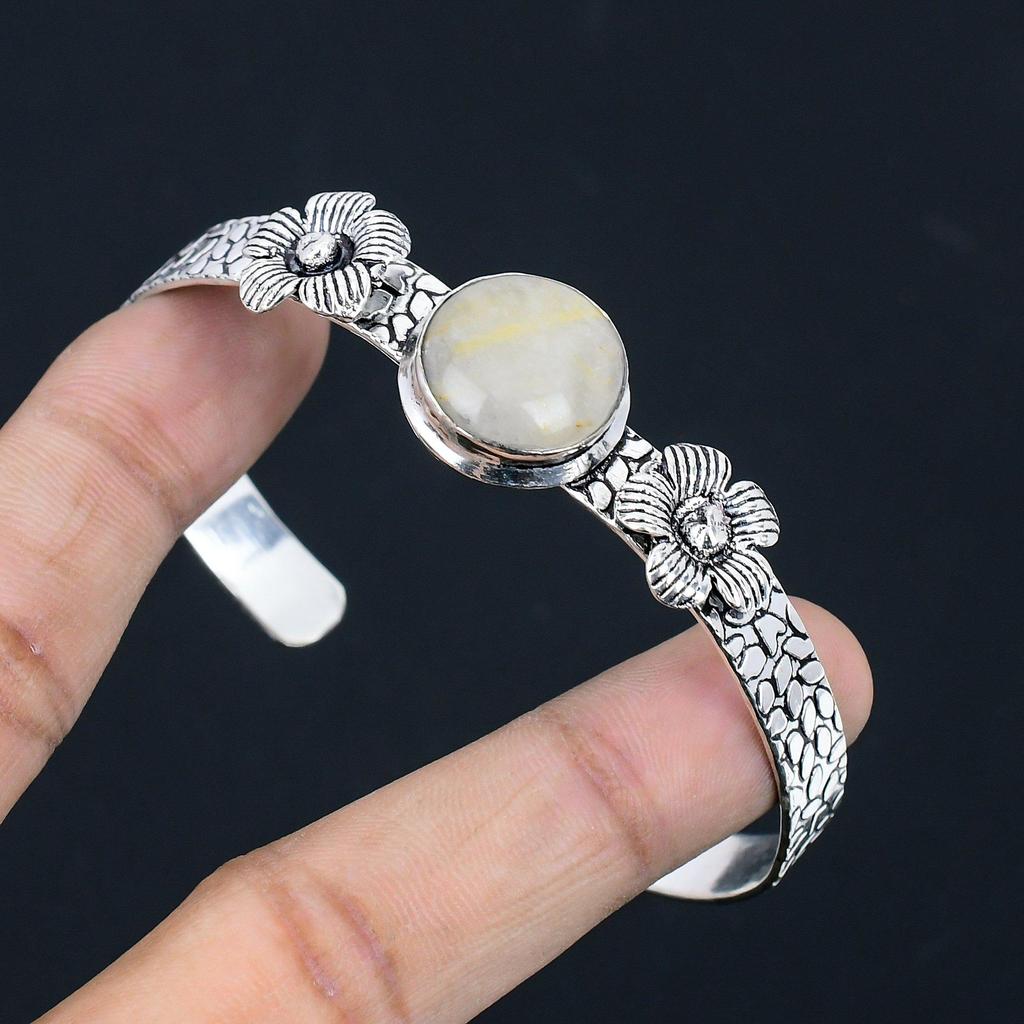 Halloween Deal 925 Silver Round Natural Golden Rutile Flower New Bangle Bracelet