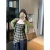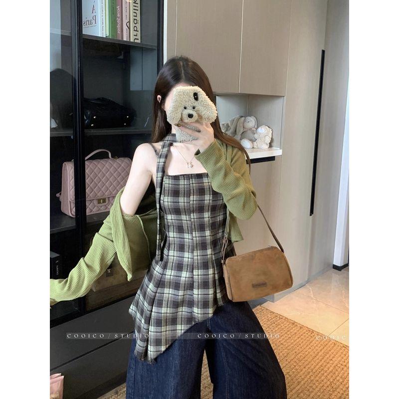 Kumikumi Sweet and Spicy Wind Suit Pure Color Cardigan Outwear Female Autumn Asymmetrical Plaid Camisole Two-piece Set