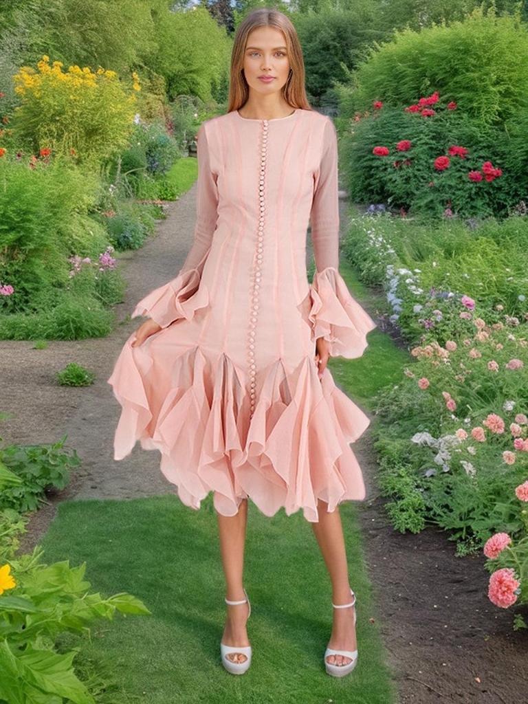 2025 Summer Women's Ruffle Design Waist-Slimming Flared Sleeve Dress