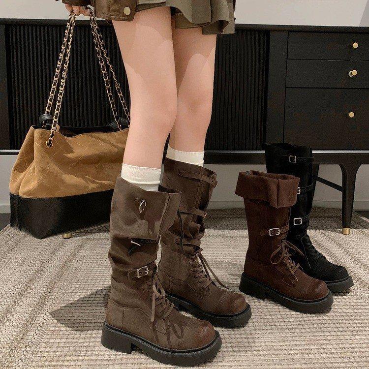 Reines Verlangen Babes~ 25 Herbst- und Winter-Beintyp-Retter verstellbarer großer Schaftumfang hoher Schaft Ritterstiefel Damen Retro Riemenstiefel