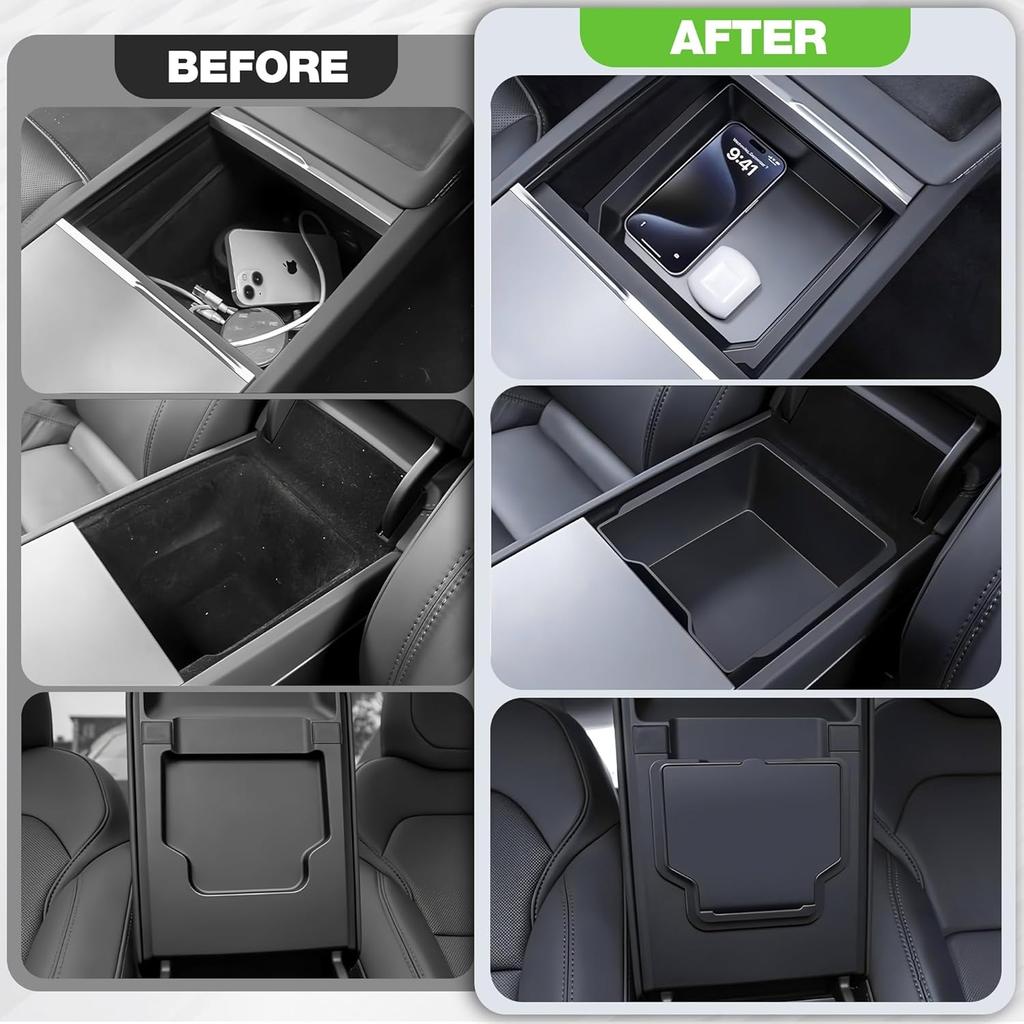 Für Tesla Model Y Juniper Model 3 Highland Mittelkonsolen-Organizer Armlehne Versteckte Aufbewahrungsbox vorne und hinten Untere Silikonmatte