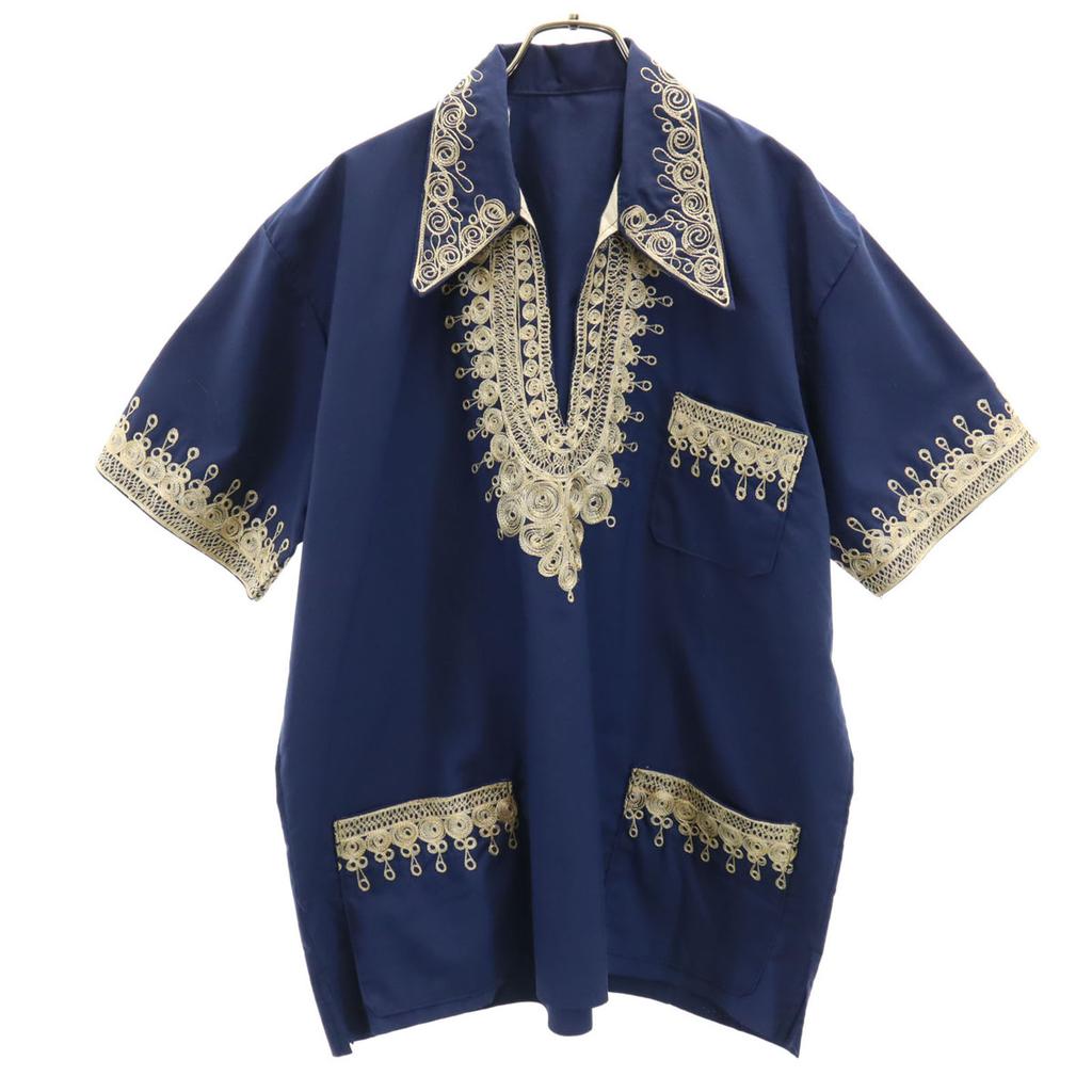 70er 80er Altes Kurzarm-Dashiki-Hemd Marineblau Afrikanische Ethnizität Herren Gebraucht