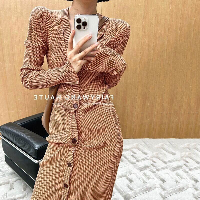 High-end cold knitted v-neck long-sleeved dress niche design temperament socialite new women
