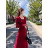 Red square-necked knitted dress for women's autumn and winter with long toasts, bridal birthday temperament, socialite dress
