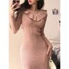 Gentle wind pink V-neck ruffle edge knitted dress autumn and winter slim base with coat and long dress inside