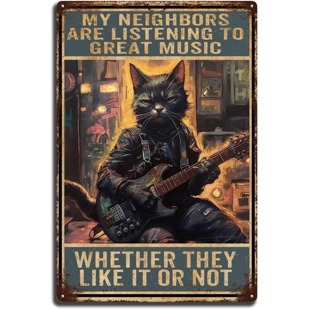Vintage Lustige Katze Gitarre Metallschild - Rockmusik Wanddeko für Bauernhof Garten Garage - "Meine Nachbarn hören großartige Musik"