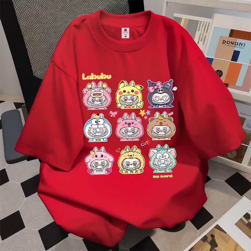 LABUBU Printed Women's Round Neck Short Sleeve Fashion Versatile Multiple LABUBU Pattern T-shirt Summer Casual Street Top