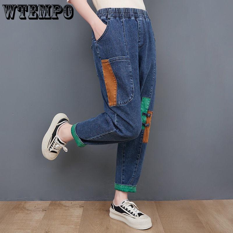 Damen Denim Elastische Haremshose Locker High Waist Casual Jeans Haremshose