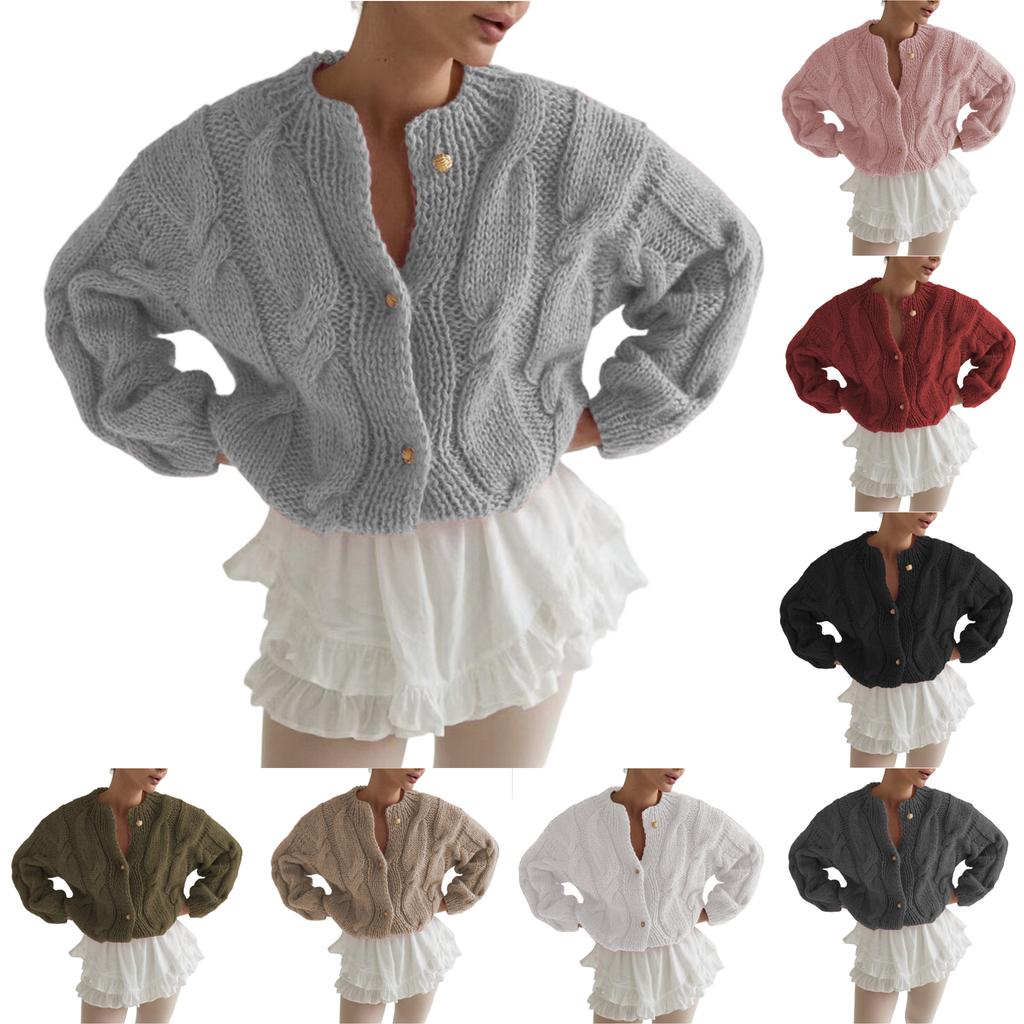 Damen Rundhals Langarm Zopfmuster Strickjacke Einfarbig Locker Gestrickte Strickjackenpullover Jacke