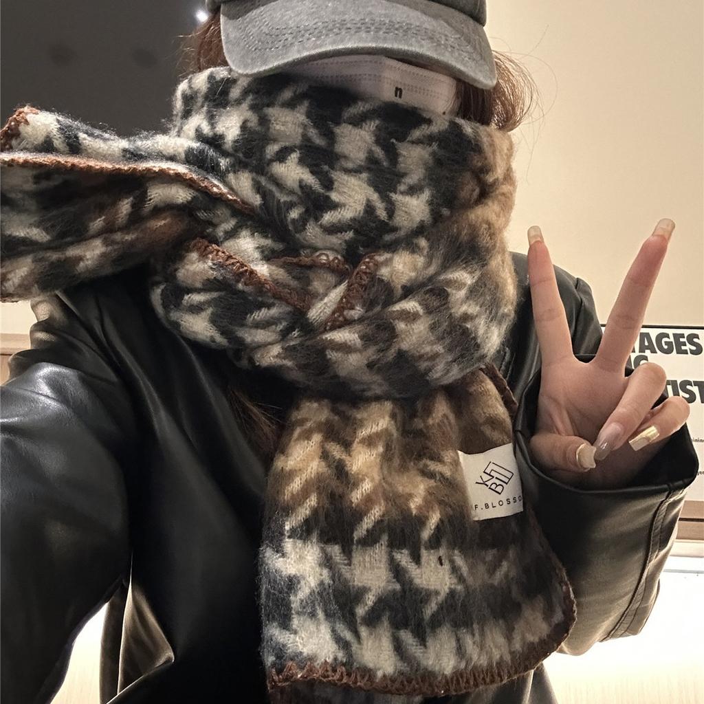 Korean Version of The New Autumn and Winter Contrasting Plaid Scarf for Girls Fashionable and Versatile Thickened and Warm Houndstooth Scarf