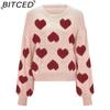 BITCED Bubble Sleeve Valentine's Pink Sweater Loose-Fit Sweet Heart-Patterned Cable-Knit Pullover