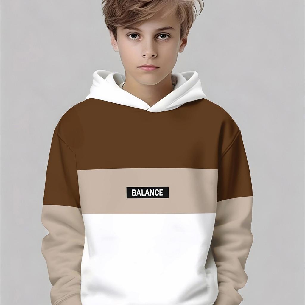 Minimalist boys' hooded sweatshirt with classic three color patchwork design, in beige, light coffee, and brown