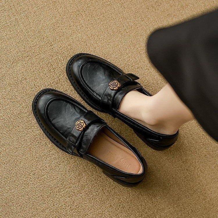 Damen-Slipper mit Leder-Kamelie, Herbst 2025, neuer britischer Stil, Retro-Kleinlederschuhe, vielseitige Einzelschuhe