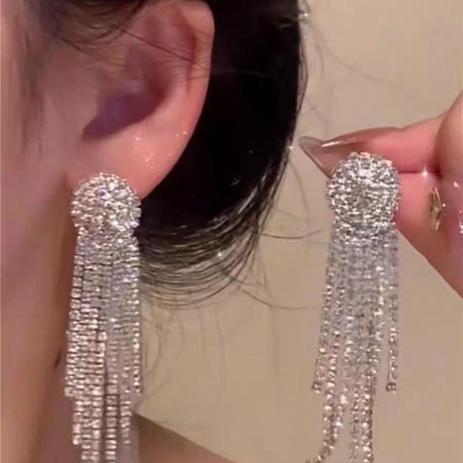 Elegant European & American Style Geometric Tassel Earrings with Inlaid Diamonds - Long, Exaggerated Design for a Slimmer Face Look