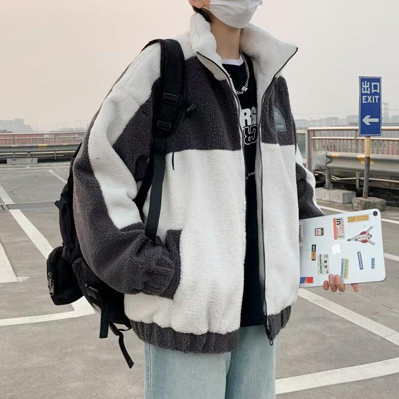 2024 Herren Trendige Lammwoll-Fleecejacke: Lockerer Stehkragen Colorblock Baumwollwattierter Mantel