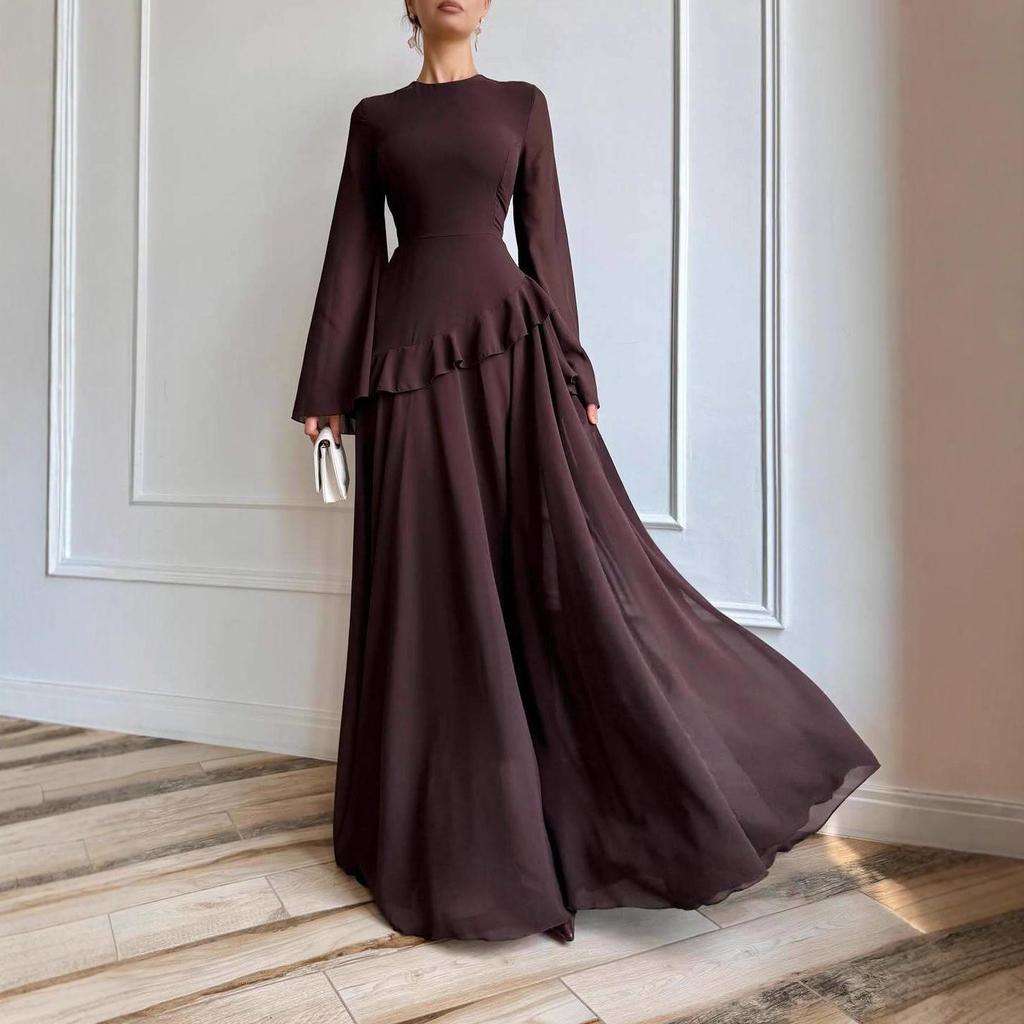 2025 Autumn High-Waist Satin Evening Dress - Round Neck, Long Sleeve, Elegant Maxi