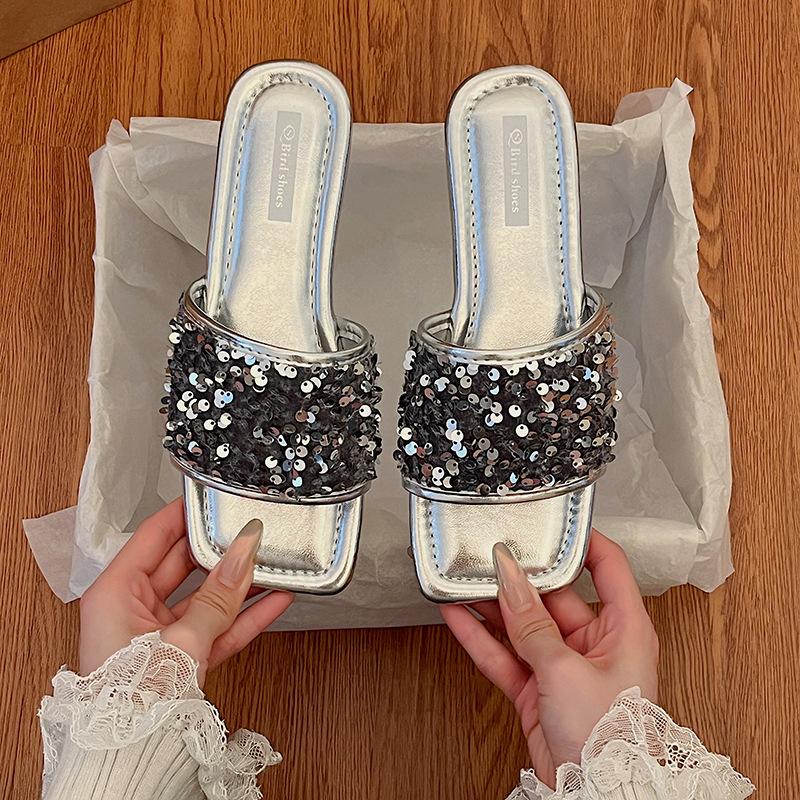 Beliebte Französische Strass Feenschuhe One-Flip Flache Absatzsandalen Out Schwarz Sommer Pailletten Hausschuhe Frau