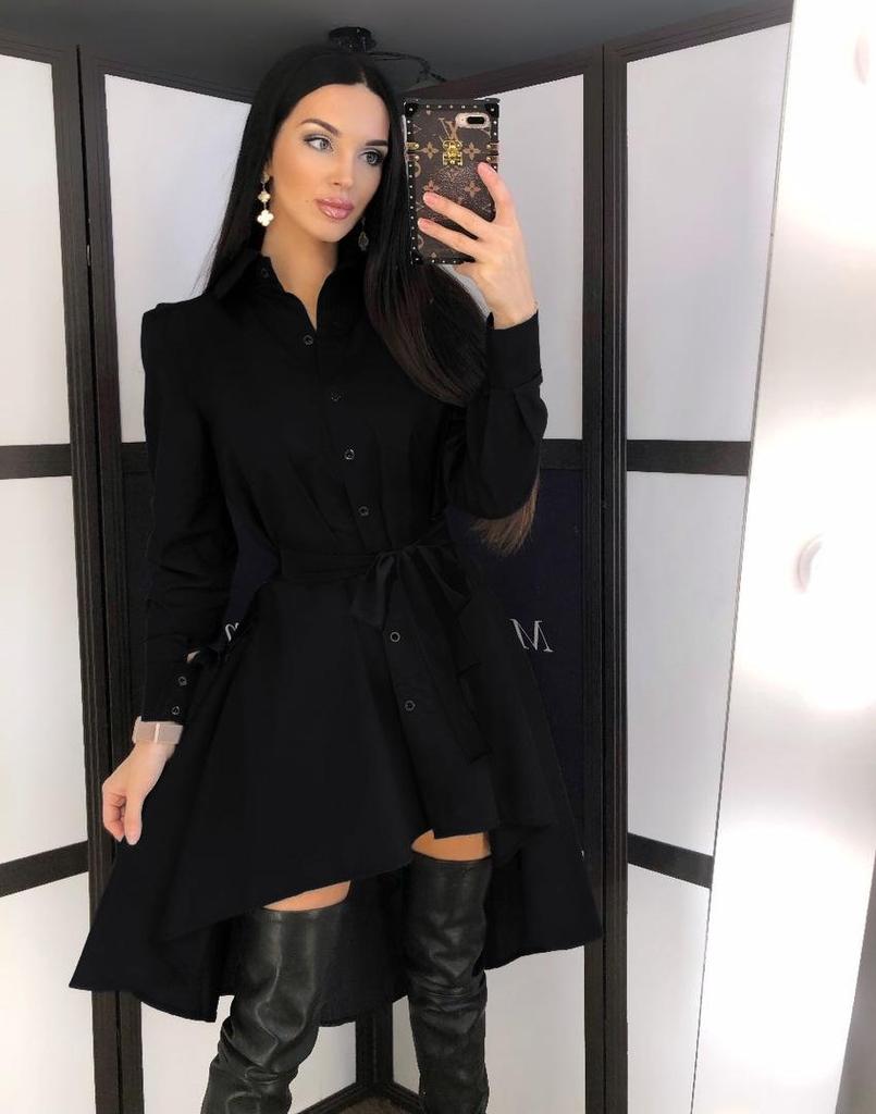 Europäisches & Amerikanisches Schlankmachendes Unregelmäßiges Taillenband Schwarzes Hemdkleid