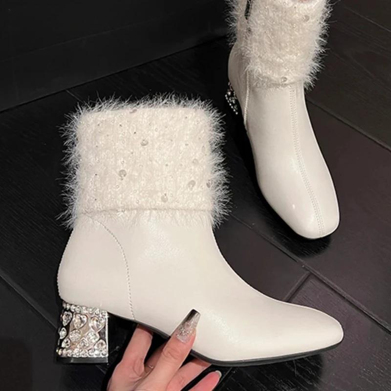 Damen Stiefeletten Kristall Fell Leder Hohe Absätze Schuhe Frau 2025 Trend Spitz Zehenbereich Klobig Mode Elegant Winter Botas De Mujer